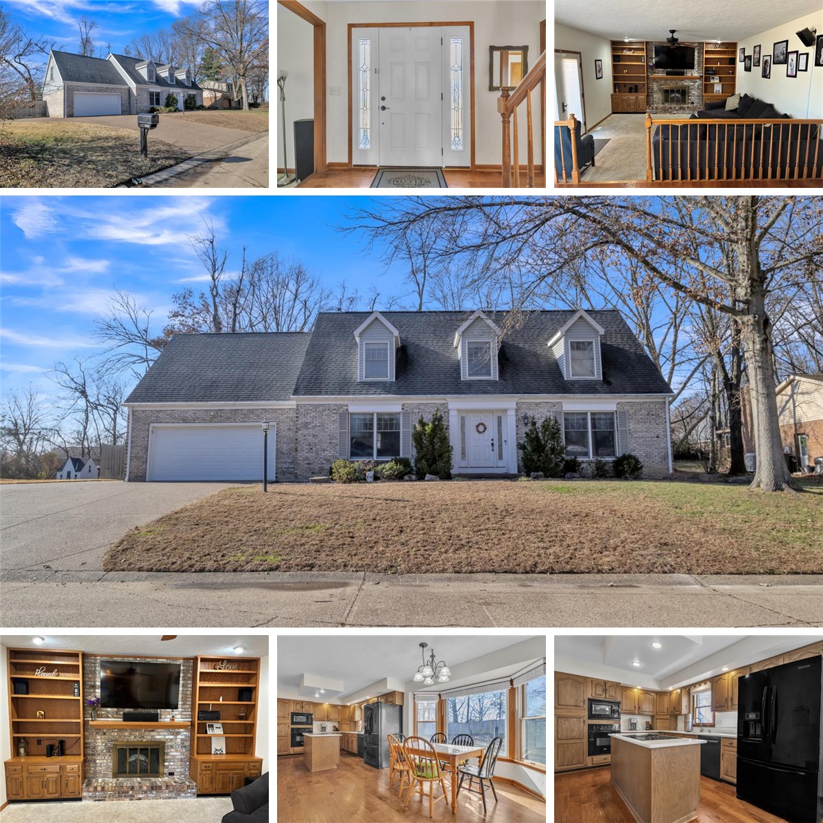 This brick 4 bed, 2.5 bath cape cod home has plenty of room and located in the established Castle Hills subdivision in the heart of Newburgh. Immediately notice the large driveway with an additional parking space to the side of the home, front rock landscaping, and the fenced backyard with an 8x8 yard barn. Step into the foyer and notice the hardwood flooring flowing to the dining room and kitchen. To the right is a den/formal living room, and to the left is a formal dining room with crown moulding. The kitchen offers the open concept that entertainers enjoy with a large island and an eat-in area centered in front of a large bay window. The space flows seamlessly to the sunken living room with twin media center and shelves surrounding the brick decorative fireplace and mantle. Step outside and grill on the patio while enjoying the large backyard. The downstairs offers a guest half bath and laundry room transition to the attached 2 car garage with tons of shelves and storage. Upstairs offers 4 bedrooms with the charm of cape cod dormer windows, a huge bonus room with two attic storage spaces, a central hallway full bath, and the large owner's suite bedroom with a walk-in closet and a bathroom with a standup shower and tiled surrounded soaker tub.