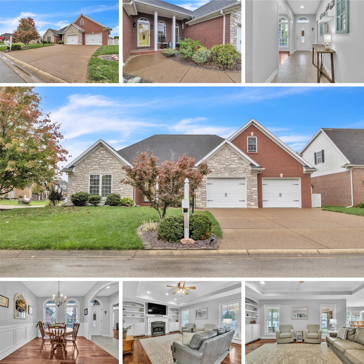 This home has the ultimate floorplan with split bedrooms and an open concept kitchen and living space with an additional dining room. Its convenient location is just minutes from everything, and you can feel the superb quality from the stone/brick exterior facade with white columns on the covered front porch to the custom trims and mouldings throughout house. Situated on a corner lot in Centerra Ridge on Evansville's far east side, this 4 bed, 2.5 bath home has over 2300 sq ft of living space plus a 19x7 glass and screened in back porch overlooking the flat back yard. The entryway features two archways entering the dining room to the right, and two bedrooms and a central full bath with custom cabinets on the left. Stepping in further allows you to view the eat-in kitchen with tiled floors and backsplash, granite counters and island, and stainless appliances all open to the living room with Kempas hardwood flooring, treyed ceilings, crown moulding, and custom built-ins. The owner's suite has twin custom shelved closets, treyed ceilings and a thoughtfully laid out ensuite with tile surrounded soaker tub, large step-in custom tiled shower, and twin vanity tops on custom cabinets. Off the large 2.5 car garage, find another half bath, laundry room with custom cabinets and a folding counter, and access upstairs to a 4th bedroom or bonus room with its own thermostat and custom built-in storage cabinets. This home has an irrigated lush lawn, vinyl privacy fence, and is completely landscaped. Notes: 9/2023: glass porch, SWAT Pest control, 7/2021 new HVAC, whole house dehumidifier 8/2025; appliances all replaced within last 2-5 years.